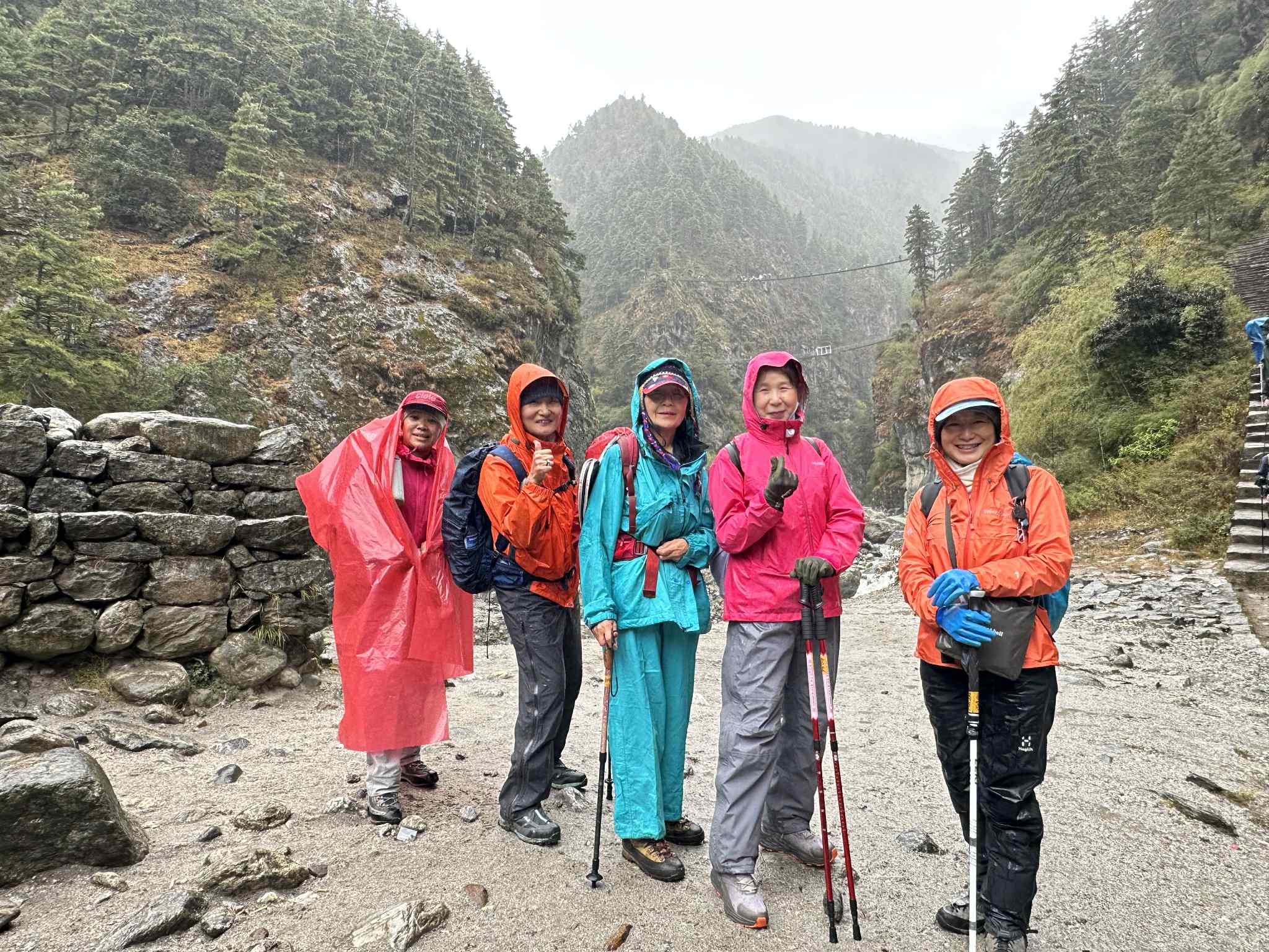 「2025年10月27日、エベレスト・ベースキャンプへの途中、お客様たちは雨天の中での道のりを経験しました。このトレックはデスティネーション・ホリデー・トレックが主催・ガイドし、悪天候にもかかわらず安全で思い出に残る体験を提供しました。」