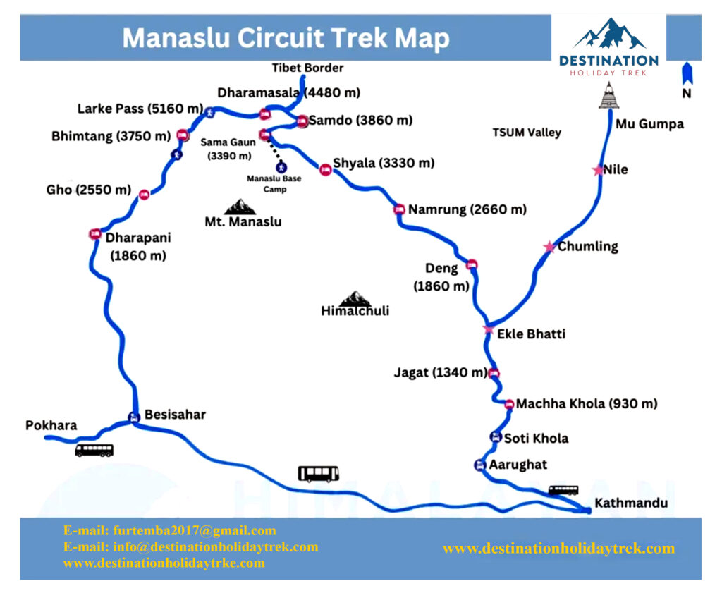 • Mountain Views: Close-up views of Mount Manaslu, Himalchuli, Ngadi Chuli, and Ganesh Himal.